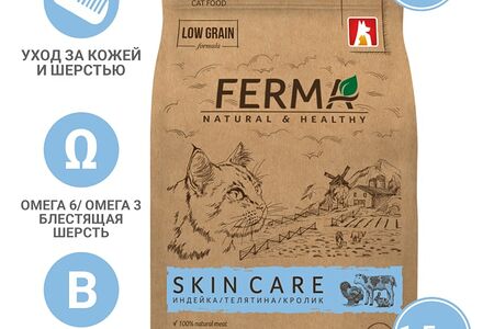Сухой корм для котов и кошек Ferma Skin care Индейка телятина кролик 1.5кг доставка
