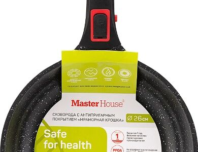Сковорода Master House Шеф Леонардо 26см - идеальный выбор для тех, кто любит готовить каждый день с удовольствием! Она изготовлена из литого алюминия - прочного и легкого материала. Благодаря двухслойному антипригарному покрытию, устойчивому к истиранию, продукты не пригорают, а сковорода легко отмывается и позволяет готовить блюда без масла. Высокие удобные бортики позволяют легко перемешивать и переворачивать пищу, а толстое дно способствует равномерному распределению жара. Съемная ручка не нагревается, что делает сковороду безопасной в использовании. Подходит для всех видов плит, кроме индукционных. Без ручки можно использовать в духовке. Можно мыть в посудомоечной машине.