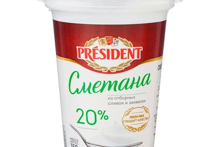 Сметана President 20% 350г 100% натуральный продукт, обладающий нежнейшей кремовой текстурой и приятным вкусом с легкой кислинкой. В составе только свежие сливки из отборного коровьего молока и закваска. Сметану можно подавать к блинчикам, оладьям, пельменям, сырникам, супам. Ее можно использовать в качестве заправки для салатов, добавлять в мясные, рыбные, овощные и грибные блюда в процессе приготовления. Продукт упакован в пластиковый стакан с герметичной фольгированной крышечкой, что позволяет сохранить его свежесть и полезные свойства в пределах всего срока годности. Продукция торговой марки President производится только из высококачественных компонентов на самом современном оборудовании.