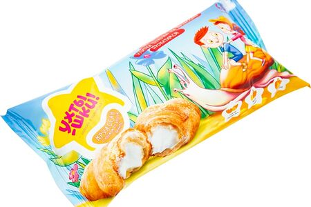 Сведения о составе: Тесто: мука пшеничная хлебопекарная высшего сорта, маргарин (дезодорированное растительное пальмовое масло и его фракции, вода питьевая, эмульгатор (моно- и диглицериды жирных кислот), соль поваренная пищевая, регулятор кислотности (лимонная кислота), консервант (карбонат калия)), вода питьевая, сахар, глюкозный сироп, дрожжи хлебопекарные пресованные, стабилизатор (моно- и диглицериды жирных кислот), соль поваренная пищевая, ароматизатор, консервант (пропионат кальция); Крем: сахар, масло пальмовое, вода питьевая, молоко сухое обезжиренное, декстроза, спирт этиловый ректификованный, желток яичный сухой, эмульгатор (эфиры полиглицерина и жирных кислот), стабилизатор (камедь целлюлозы), регуляторы кислотности (пирофосфаты, орто-Фосфорная кислота), ароматизатор, консервант (сорбат калия), лактозаПищевая ценность: 452,7,28,43Условия хранения: 6Срок годности в днях: 150Страна изготовления: РоссияСведения об упаковке: ПакетПроизводитель: Чипита