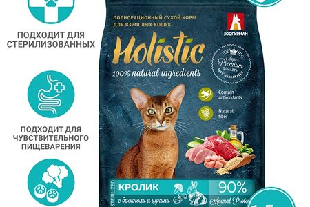 Сухой корм для кошек Зоогурман Holistic Кролик с брокколи и цукини 1.5кг - полноценный рацион из новой линейки сухих кормов Holistic, основанной на природных потребностях вашего питомца. Легкоусвояемые источники животного протеина, овощи, ягоды, фрукты, полезные травы, исключительно натуральные добавки, богатые витаминами и клетчаткой цельные злаки – это компоненты рационов Holistic. Чистый состав данной линейки обеспечивает её многогранные профилактические свойства. Благодаря натуральным добавкам и легкоусвояемым ингредиентам питомцы будут более устойчивы к возникновению распространенных заболеваний.