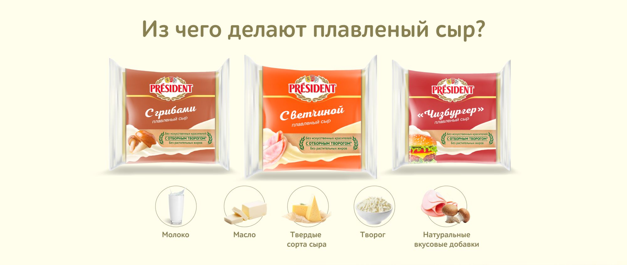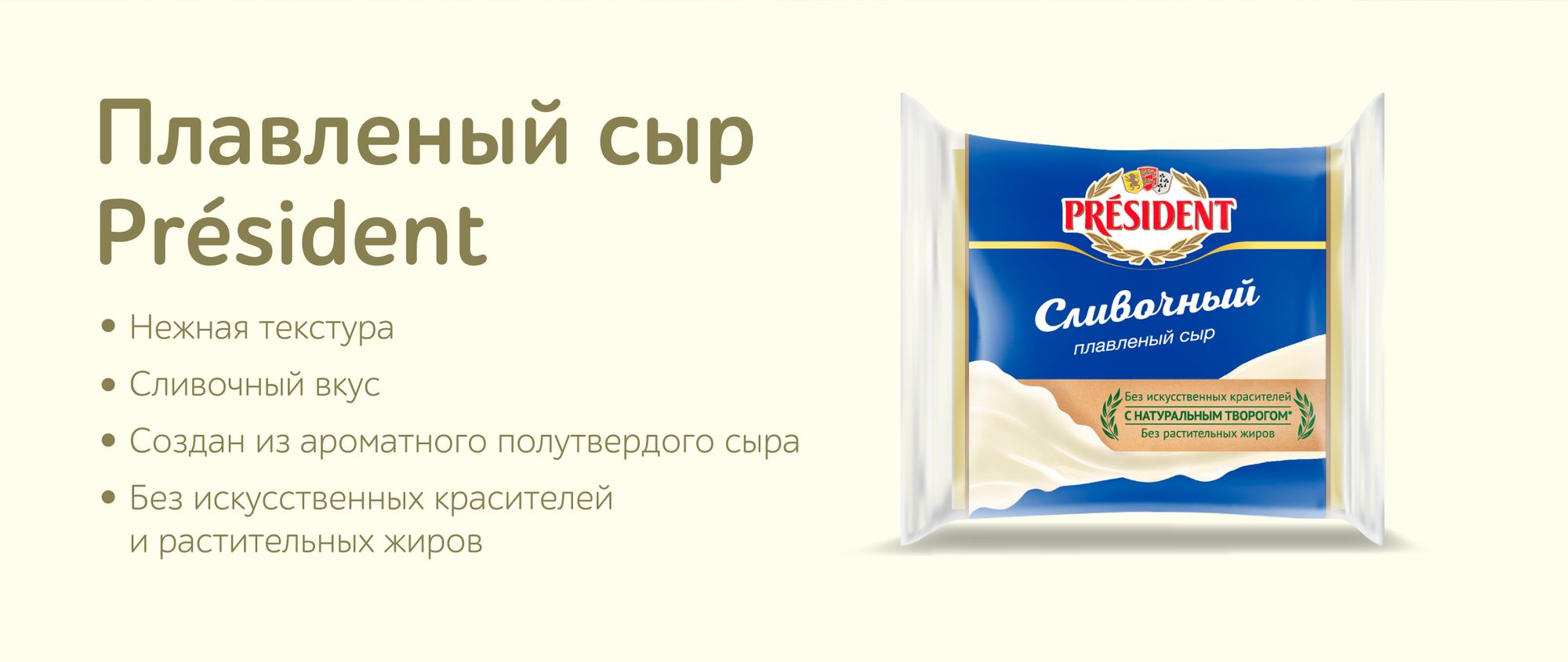 Сыр плавленый President Сливочный 40% 150г представлен ведущим экспертом в сыроварении и приготовлен из высококачественных ингредиентов, среди которых натуральный сыр, сливочное масло, творог и сливки. У него нежный сбалансированный вкус и однородная пластичная текстура без комочков. Он прекрасно плавится, подходит для приготовления бутербродов, сытных рулетов и бургеров, холодных закусок, выпечки и горячих блюд. Тонкие ломтики в индивидуальной упаковке удобно брать с собой в дорогу, на работу или на пикник.