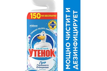 Чистящее средство для унитазов "Туалетный Утенок Гель глубокого очищения Морской", 900 мл. "Туалетный Утенок Гель глубокого очищения" для унитаза обеспечивает максимальное очищение налета и ржавчины, а также устраняет неприятные запахи и дарит свежий аромат. Сильная формула на основе соляной кислоты убивает 99,99% микробов, включая вирусы, аналогичные по устойчивости SARS-COV-2, вызывающему COVID-19. Благодаря уникальной форме горлышка бутылки лучше попадает в труднодоступные места скопления бактерий под ободком унитаза. Основные преимущества: убивает 99,99% микробов; устраняет известковый налет и минеральные отложения; уникальная форма горлышка обеспечивает нанесение на 360°; восхитительный свежий аромат без запаха хлора. Дезинфицирующий эффект в отношении исследованных микроорганизмов (E.coli, S. aureus, P. aeruginosa, C. albicans) достигается при экспозиции 30 минут. Дезинфицирующий эффект в отношении исследованных вирусов (Poliovirus, Adenovirus) достигается при экспозиции 15 минут.