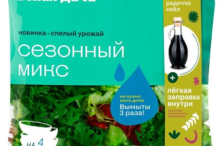 Салатный микс Белая Дача Модена с заправкой на основе бальзамико 135г – сочное ассорти, которое поможет вам питаться правильно и сбалансированно без особых усилий. В его состав вошли: хрустящий айсберг, терпкий радиччо и кудрявый кейл. Ингредиенты уже трижды промыты в ключевой воде, просушены и нарезаны. В состав также входит легкий соус на основе итальянского «Бальзамико». Вам осталось лишь пересыпать микс в салатник, полить его заправкой и перемешать. Высококачественная упаковка позволяет сохранить свежесть и вкусовые свойства продукта в пределах всего срока годности. Салатные смеси ТМ «Белая Дача» – это сочетание отменного вкуса, пользы и натуральности.