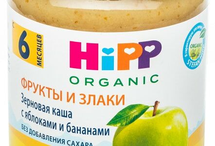 Каша HiPP Зерновая с яблоками и бананами 190г – органическое лакомство, изготовленное из яблочного и бананового пюре с добавлением пшеничной муки грубого помола и цельнозерновой овсяной муки. Рекомендуется для питания детей с 6 месяцев. Обладает нежной консистенцией и приятным вкусом. Не содержит добавленного сахара, молочного белка, консервантов, красителей и ароматизаторов. Идеально подходит для полдника. Эта уникальная готовая кашка служит источником витаминов, микроэлементов и клетчатки, благотворно влияет на работу ЖКТ и обеспечивает ребенка необходимой энергией. Все фрукты и злаковые культуры, входящие в ее состав, выращены в естественных условиях без применения химических удобрений и пестицидов.