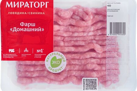 Фарш Мираторг Домашний из свинины и говядины 400г сделан из отборного охлажденного мяса по современным технологиям. Широко используется в кулинарии и является незаменимым ингредиентом многих блюд. Котлеты, фрикадельки, зразы, ежики, запеканка, тефтели, голубцы - все это и многое другое вы сможете приготовить из нежного мясного фарша. В обжаренном виде хорошо сочетается с макаронами и гречкой, используется в качестве начинки для пирожков и самсы, как основной ингредиент знаменитого соуса Болоньезе.