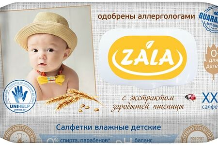 Серию детских салфеток Zala объединяет простой, максимально натуральный состав пропитывающего лосьона и полезные для нежной кожи новорожденных компоненты, такие как экстракты хлопка, пшеницы, молочная кислота, пребиотик, провитамин В5 (пантенол), из них два вида салфеток – без запаха и без отдушек, в двух других – нежные гипоаллергенные отдушки; все это позволяет сделать очищение абсолютно безопасным и полезным. Экстракт зародышей пшеницы успокаивает, смягчает кожу, устраняет сухость, раздражение и шелушение. Молочная кислота мягко очищает, увлажняет кожу и способствует ее регенерации. D-пантенол – активный компонент, мягко увлажняет и восстанавливает клетки кожи. Мы используем «зеленый» консервант последнего поколения на основе органических кислот, который соответствует требованиям Ecocert и Cosmos в натуральной и органической косметике. 0% силиконов, парабенов, спирта, феноксиэтанола.