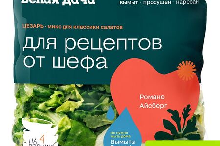 Салат Белая Дача Цезарь 150г хрустящий микс из серии Для рецептов от шефа , состоящий из свежих листьев романо и айсберга. Промыт, просушен, нарезан и полностью готов к употреблению. Имеет пикантный ореховый вкус, содержит множество полезных для организма веществ и витаминов. Подходит в качестве гарнира к мясному стейку или рыбному филе. Используя этот салатный микс в качестве основы, можно приготовить Цезарь с запеченной куриной грудкой, пармезаном, томатами черри и сухариками, или сделать оригинальный салат, добавив слабосоленую семгу, анчоусы и заправку из лимонного сока. Идея для приготовления фирменного соуса уже указана производителем на упаковке.