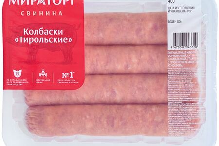 Колбаски Мираторг Тирольские с зеленью 400г - 100% натуральный продукт, приготовленный по традиционному австрийскому рецепту из отборной свинины и пряных специй: тмина, фенхеля и смеси острых перцев. Они получаются одинаково сочными и нежными при любом способе приготовления: на гриле, на сковороде или в духовке. Подавайте их со свежими или печеными овощами, пикантными соусами и соленьями. Не содержит ГМО и гормонов роста. Упакован с использованием защитной атмосферы, что позволяет сохранить все питательные и вкусовые качества в течение всего срока годности.