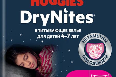 Подгузники трусики Huggies Drynites для девочек 4-7 лет 10шт – одноразовые трусики, предназначенные для детей с ночным недержанием (энурезом). Разработаны с учетом анатомических особенностей девочек, имеют 5 слоев защиты и высокую степень впитывания. Тонкие и мягкие на ощупь, они изготовлены из бесшумного и дышащего материала, а их особый впитывающий слой способен поглотить до 30% больше жидкости, чем обычные трусики-подгузники. Благодаря продуманной конструкции и эластичным вставкам по бокам они хорошо сидят и не выделяются под одеждой, а по виду напоминают настоящее нижнее белье. Немаловажное достоинство линейки – стильный дизайн, который непременно понравится любой девочке. Теперь ваш ребенок сможет спать спокойно, а вам больше не придется вставать среди ночи, чтобы заменить ему постель и пижаму. В упаковке 10 штук. Впитывающая способность изделий: от 650 до 800мл.