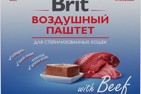 Влажный корм для стерилизованных кошек Brit Воздушный паштет с говядиной 100г – полнорационный консервированный корм премиум-класса. Предназначен для взрослых стерилизованных и кастрированных животных. Производится по технологии аэрации без добавления искусственных ароматизаторов и консервантов. Сырье помещают в специальный аппарат – паштетный эмульситатор, где оно одновременно измельчается, смешивается, взбивается и насыщается воздухом. Готовый паштет имеет нежную, воздушную консистенцию и приятный вкус, благодаря чему обязательно понравится вашему питомцу. Состав корма тщательно сбалансирован: он содержит натуральное мясо (в том числе говядину), витамины, минералы, таурин, полезные растительные компоненты. Герметичная алюминиевая упаковка нового поколения надежно сохраняет свежесть продукта и легко открывается.