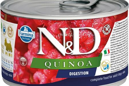 Поддержка пищеварения. Полнорационный влажный корм для взрослых собак. Farmina N&D Dog Quinoa Digestion — диетический полнорационный влажный корм для собак, рекомендуемый при нарушениях переваривания пищи и при экзокринной недостаточности поджелудочной железы. Farmina N&D Беззерновой с киноа — линия беззерновых натуральных кормов для собак, содержащих природный компонент киноа. Специально разработанные с учетом природы собак, данные корма на 60% состоят из высококачественных ингредиентов животного происхождения и на 40% из овощей, фруктов, витаминов и минералов. Киноа — чрезвычайно полезный злак, способствующий здоровому пищеварению, поддерживающий иммунную систему.