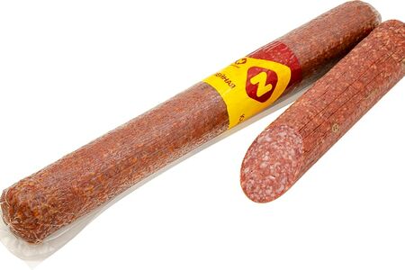 Колбаса Останкино Юбилейная сырокопченая приготовлена по оригинальной рецептуре Останкинского мясоперерабатывающего завода из филе куриных грудок, свинины и шпика с добавлением ароматных пряностей. Срез насыщенного красно-розового цвета с частыми вкраплениями мелкого шпика. Продукция бренда "Останкино" производится на новейшем оборудовании из Германии и Австрии, в качестве сырья используется охлажденное мясо и натуральные специи, копчение происходит на натуральной щепе лиственных деревьев. Упакована в фиброузную оболочку.