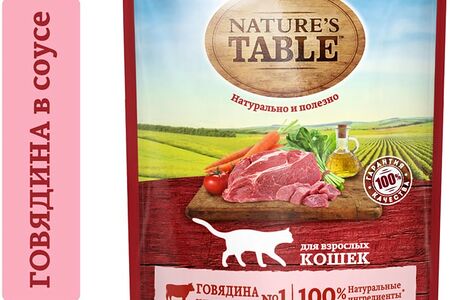 Корм для кошек Natures Table Говядина в соусе 85г высококачественный продукт для кошек любых пород, который не только превосходно утолит голод, но и насытит кошачий организм всеми необходимыми питательными веществами. Кусочки свежей говядины в аппетитном соусе с добавлением подсолнечного масла, рыбьего жира, натуральных овощей, рыбных и куриных продуктов изысканное и полезное сочетание для самых привередливых питомцев. И главное: никаких красителей, ароматизаторов, консервантов и ГМО. Блестящая шерсть, здоровая кожа, отличное пищеварение, блеск в глазах все, что нужно вашей кошке, чтобы оставаться здоровой, подвижной, энергичной долгие годы!