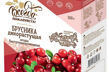 Брусника Всегда пожалуйста Дикорастущая быстрозамороженная 300г 100% натуральная продукция, прошедшая многоэтапный контроль качества. Спелые ягоды бережно собирают, очищают от мусора, промывают, а затем подвергают шоковой заморозке. Этот метод замораживания считается самым оптимальным, ведь он позволяет сохранить в плодах естественный вкус и максимум ценных веществ. Брусника обогащает организм человека витаминами, микроэлементами и антиоксидантами, улучшает работу ЖКТ, оказывает антисептическое действие и предотвращает развитие атеросклероза. Подходит для приготовления киселей, морсов, компотов, выпечки и варенья. Идеально впишется в рацион вегетарианцев, веганов, сторонников диетического питания, постящихся. Картонная упаковка предохраняет продукцию от повреждений в процессе транспортировки.