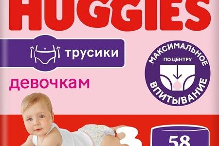 Подгузники трусики Huggies для девочек 6-11кг 3 размер 58шт с новыми героями, липучкой-утилизатором и усиленным впитывающим слоем созданы с использованием новейших азиатских материалов и технологий. В них вашей малышке будет комфортно и свободно, ничто не стеснит движения. Трусики-подгузники стали еще лучше и надежнее благодаря увеличенному впитывающему слою. Дополнительный сверхмягкий слой на пояске обеспечивает комфортную и эластичную посадку с меньшим давлением на животик, снижая риск появления красных следов на коже ребенка. В течение дня поясок адаптируется к меняющимся размерам животика, нежно обнимая его. Специальный впитывающий слой DryTouch расположен с учетом анатомических особенностей девочек (смещен к центру); он впитывает влагу за секунды, не образуя комок между ножек, и сохраняет кожу сухой днем и ночью. Мягкие эластичные резиночки вокруг ножек обеспечивают дополнительную защиту от протекания. Легко надеть — просто натяните трусики, легко снять — разорвите боковой шов. Липучка-утилизатор закроет запах на замок. Индикатор влаги подскажет, когда придет время сменить трусики. 2 замечательных новых дизайна в одной упаковке. Трусики не содержат отдушек, хлора и латекса для лучшей заботы о коже вашей активной девочки и о природе.