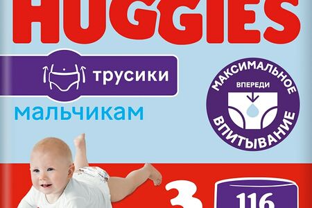 Подгузники трусики Huggies для мальчиков 6-11кг 3 размер 116шт с новыми героями, липучкой-утилизатором и усиленным впитывающим слоем созданы с использованием новейших азиатских материалов и технологий. В них вашему малышу будет комфортно и свободно, ничто не стеснит движения. Трусики-подгузники стали еще лучше и надежнее благодаря увеличенному впитывающему слою. Дополнительный сверхмягкий слой на пояске обеспечивает комфортную и эластичную посадку с меньшим давлением на животик, снижая риск появления красных следов на коже ребенка. В течение дня поясок адаптируется к меняющимся размерам животика, нежно обнимая его. Специальный впитывающий слой DryTouch расположен с учетом анатомических особенностей мальчиков (смещен вперед), он впитывает влагу за секунды, не образуя комок между ножек, и сохраняет кожу сухой днем и ночью. Мягкие эластичные резиночки вокруг ножек обеспечивают дополнительную защиту от протекания. Легко надеть — просто натяните трусики, легко снять — разорвите боковой шов. Липучка-утилизатор закроет запах на замок. Индикатор влаги подскажет, когда придет время сменить трусики. 2 замечательных новых дизайна в одной упаковке. Трусики не содержат отдушек, хлора и латекса для лучшей заботы о коже вашего активного мальчика и о природе.