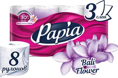 Бумага туалетная Papia "Балийский цветок", 3 слоя, 8 рулонов. Ароматизированная трехслойная туалетная бумага Papia "Балийский цветок" с цветным тиснением и перфорацией. "Балийский цветок" — нежный цветочный аромат, который подарит вам наслаждение. Уникальная технология двустороннего тиснения бумаги обеспечивает лучшую впитываемость и мягкость с обеих сторон. Теперь содержит экстракт хлопка. Обновленная Papia — выбор тех, кто всегда стремится к большему. Благодаря новой инновационной технологии Termo Power Tech теперь еще более мягкая, пышная и прочная.