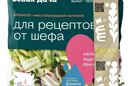 Салат Белая Дача Аликанте 130г микс с благородной горчинкой из серии Для рецептов от шефа . Состоит из сочных листьев фриссе, айсберга и радиччо. Все компоненты промыты, высушены, удобно нарезаны и полностью готовы к употреблению. Такой салат станет идеальной парой к обжаренным хрустящим креветкам, теплому чесночному хлебу, каперсам и маслинам без косточки; он хорошо сочетается со спелыми красными томатами и сладким луком. Благодаря богатому содержанию витаминов и минералов, он укрепляет иммунитет и улучшает пищеварение. На всех этапах производства используется оптимально низкий температурный режим, который сохраняет свежесть, а также все полезные и вкусовые свойства продукта. Рецепт фирменного блюда на основе смеси указан на обратной стороне упаковки.
