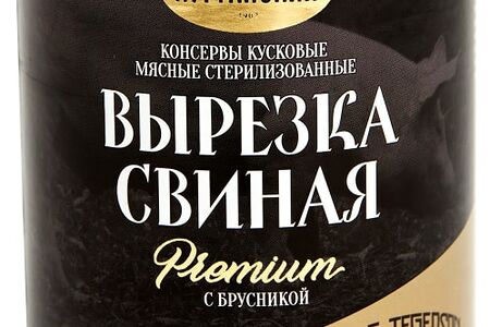 Сведения о составе: СВИНИНА (ВЫРЕЗКА), ВОДА, ЖЕЛАТИН, БРУСНИКА, СОЛЬ ПОВАРЕННАЯ ПИЩЕВАЯ, СОЛЬ НИТРИТНАЯ (СОЛЬ ПОВАРЕННАЯ ПИЩЕВАЯ, ФИКСАТОР ОКРАСКИ Е250), САХАР-ПЕСОКПищевая ценность: 144,18,8,0Условия хранения: 20,0Срок годности в днях: 730Страна изготовления: РоссияСведения об упаковке: Жестяная банкаПроизводитель: Курганский мясокомбинат Стандарт
