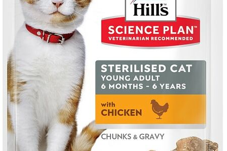 Корм для кошек Hills Science Plan Sterilised Курица 85г - это биологически обоснованное питание премиального класса, разработанное опытными ветеринарами-диетологами специально для стерилизованных кошек и котов в возрасте до 6 лет. Идеально сбалансированный состав содержит оптимальное количество питательных веществ и нутриентов, которые помогут вашему питомцу сохранить здоровый вес и предотвратят образование камней в мочевом пузыре. Нежные мясные кусочки в аппетитном соусе приготовлены из высококачественного животного протеина (курицы и мяса домашней птицы); они обогащены витаминами и минералами для хорошего самочувствия, а также комплексом антиоксидантов с клинически подтвержденным эффектом для сильного иммунитета.