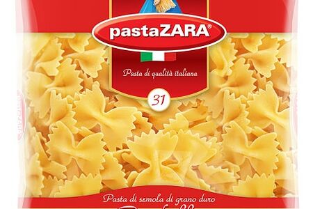 Макароны Pasta ZARA №31 Farfalle 500г - это особый формат пасты, приготовленный по традиционному рецепту семьи Браганьоло, основателей и владельцев компании. Оригинальные макаронные изделия в форме маленьких бабочек (или бантиков) из крупки твердых сортов пшеницы содержат оптимальное количество клейковины, поэтому при варке отлично держат форму и сохраняют необходимую твердость. Чтобы получить правильную текстуру al dente, фарфалле следует варить в кипящей подсоленной воде в течение 13-15 минут, затем слить и, не промывая, смешать с соусом.