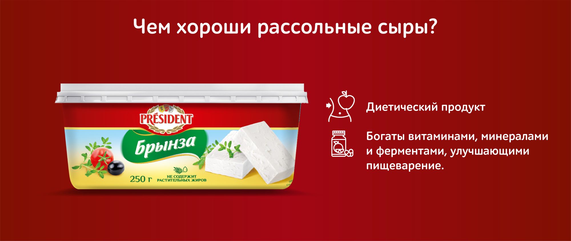 Сыр President Брынза 45% 250г - это мягкий рассольный сыр, приготовленный из пастеризованного молока и закваски без добавления растительных жиров. Это универсальный и очень популярный в мировой кулинарии продукт, который можно использовать для приготовления салатов, легких закусок и рулетов, бутербродов, выпечки и горячих блюд. Особенно хорошо сочетается с овощами, свежими и печеными. У брынзы достаточно плотная консистенция, однако ее можно и резать, и намазывать. Упакована в пластиковую ванночку с рассолом.