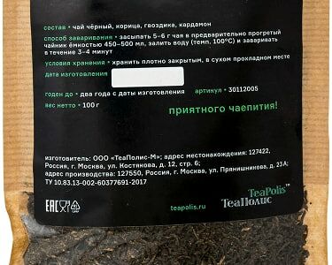 Сведения о составе: Чай чёрный, корица, гвоздика, кардамонСрок годности в днях: 730Страна изготовления: РоссияСведения об упаковке: ПакетПроизводитель: ТеаПолис