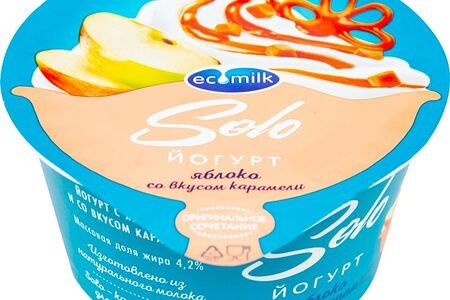 Йогурт Экомилк Яблоко со вкусом карамели 4.2% 130г – нежный десерт с густой консистенцией и ярким вкусом. Производится на основе натурального молока на современном российском предприятии, оснащенном высокотехнологичным оборудованием. В его составе также присутствуют кусочки спелых яблок и натуральный ароматизатор «Карамель» – они придают лакомству особую прелесть и делают его неповторимым. Йогурт – это полезный кисломолочный продукт, который служит источником витаминов и минералов, помогает укрепить иммунитет, улучшает пищеварение. Ecomilk Solo – это новая линейка молочных десертов, которые помогут вам отвлечься от повседневной серости и ощутить прилив вдохновения.