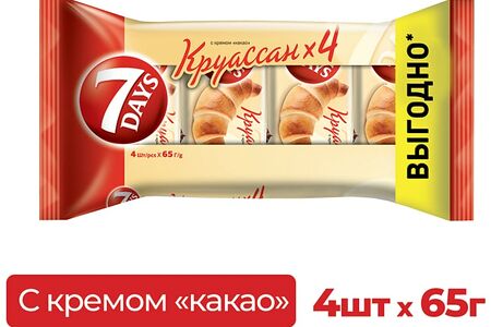 Насыщенный яркий вкус крема "Какао" в каждом круассане 7 Days никого не оставит равнодушным. Удобный формат мультиупаковки: 4 круассана 7 Days. Удобно взять с собой про запас или угостить близких! Круассан 7 Days — это идеальный перекус в любое время дня. Он удобно упакован и готов к употреблению. Великолепный дуэт воздушного слоёного теста и нежной начинки поможет притупить чувство голода и сделает ваш день восхитительным.