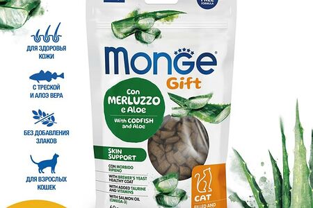 Лакомство для кошек Monge Gift Skin support Хрустящие подушечки с треской и алоэ вера для здоровой кожи 60г доставка