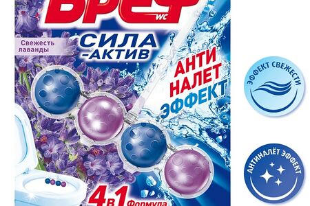 "Бреф Сила-Актив" с антиналет-эффектом — подвесной туалетный блок с формулой против известкового налета. Активная формула с антиналет-эффектом действует в 4 направлениях: образует очищающую пену, которая обеспечивает гигиеническую чистоту; предотвращает образование известкового налета; помогает предотвратить повторное загрязнение; придает туалетной комнате свежий аромат лаванды после каждого смывания. "Бреф Сила-Актив" придает антиналет-эффект при каждом смывании.