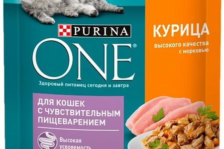 Влажный корм для кошек с чувствительным пищеварением Purina ONE с курицей и морковью 75 г разработан экспертами Purina для вашего питомца. Высококачественный белок из мяса курицы легко усваивается, не вызывая у животных чувства тяжести после кормления. Пребиотики восстанавливают баланс микрофлоры кишечника и помогают нормализовать стул. Омега-3 и омега-6 жирные кислоты отвечают за здоровую кожу, блестящую и прочную шерсть. Благодаря уменьшенной концентрации минералов удается снизить риск образования мочевых камней, а содержащиеся в корме антиоксиданты укрепляют иммунитет. Не содержит искусственных красителей, консервантов и ароматизаторов.