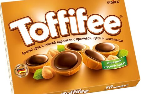 Конфеты Toffifee 250г - это оригинальное лакомство из Германии, известное всему миру уже более 40 лет. Toffifee - не просто конфета, а настоящее произведение кондитерского искусства. Сначала отливается маленькая чашечка из мягкой карамели; затем в нее кладется цельный лесной орех, обжаренный до особого аромата и хруста; сверху на орех выливается кремовая нуга из натуральной ореховой пасты, перемешанной с отборным какао; завершает эту искусную кондитерскую композицию капля великолепного молочного шоколада. Конфеты выложены на подложку-коррекс и упакованы в герметичный пакет и картонную коробку. Всего в упаковке - 30штук.