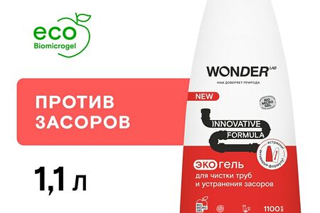 Средство для чистки труб и устранения засоров Wonder Lab 1.1л - экологичный гель для очищения любого типа труб. Инновационная формула удаления загрязнений Biomicrogel из овощей и фруктов эффективно растворяет волосы, жир, шерсть животных и остатки пищи, уничтожает микробы и бактерии. Средство выпускается в формате густого геля, который лучше удерживается на очищаемых поверхностях и гораздо медленнее стекает по трубам. Смывается горячей водой без остатка. Для профилактики засоров рекомендуется использовать ежемесячно. Не содержит токсичных компонентов, не разрушает трубы, не наносит вреда септикам и окружающей среде, всего за 1 день разлагается на 98%.