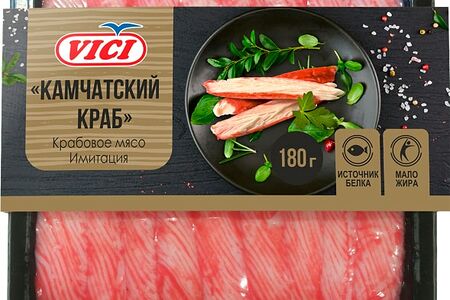 Крабовое мясо Vici Камчатский краб охлажденное 180г изысканный деликатес, который станет достойным украшением праздничного стола. Это имитированное крабовое мясо, которое своим внешним видом, волокнистой структурой и вкусом напоминает настоящее мясо краба. Производится из сурими и вспомогательных компонентов по новейшей технологии, позволяющей получить высококачественный, нежный и сочный продукт. Сурими это рыбный фарш, который традиционно делается из белой океанической рыбы. Используйте продукт для приготовления рулетов, закусок, канапе и для декорирования готовых блюд. Вакуумная упаковка надежно сохраняет свежесть, вкусовые свойства и текстуру в течение всего срока годности.