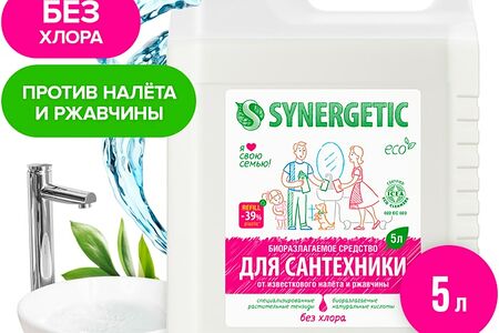 Средство для мытья сантехники Synergetic 5л произведено из растительных Н-тензидов и натуральных кислот: молочной, лимонной и гликолевой. Благодаря щадящему экологичному составу оно подходит для мытья керамической плитки, акриловых, фаянсовых, эмалированных и хромированных поверхностей. Без труда удаляет известковый налет, ржавчину, минеральные отложения и неприятные запахи. Ликвидирует 100% микробов и бактерий, обладает ненавязчивым легким ароматом бергамота, мяты, лимона и сантала. Не содержит в составе хлора и отлично работает в жесткой и холодной воде. Безопасно для детей, домашних животных и людей с чувствительной кожей.