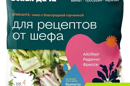 Салат Белая Дача Аликанте 130г микс с благородной горчинкой из серии Для рецептов от шефа . Состоит из сочных листьев фриссе, айсберга и радиччо. Все компоненты промыты, высушены, удобно нарезаны и полностью готовы к употреблению. Такой салат станет идеальной парой к обжаренным хрустящим креветкам, теплому чесночному хлебу, каперсам и маслинам без косточки; он хорошо сочетается со спелыми красными томатами и сладким луком. Благодаря богатому содержанию витаминов и минералов, он укрепляет иммунитет и улучшает пищеварение. На всех этапах производства используется оптимально низкий температурный режим, который сохраняет свежесть, а также все полезные и вкусовые свойства продукта. Рецепт фирменного блюда на основе смеси указан на обратной стороне упаковки.