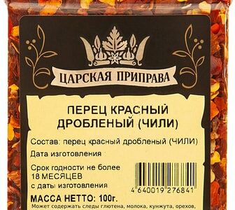 Специя Царская приправа Перец красный дробленый (Чили) 100г непременно порадует любителей острой пищи. Название этого перчика в переводе с ацтекского означает «красный». Некоторые его сорта настолько «злы», что прикасаться к плодам можно только в резиновых перчатках – так велика опасность получить ожог кожи. Вкус перечных стручков можно немного смягчить, убрав с плодов кожицу и очистив их от семян. Чили широко применяется во всем мире как самостоятельная пряность, придающая блюдам ярко-красный акцент и определенную жгучесть. В основном его используют для приготовления мясных и рыбных блюд, супов, колбасных изделий, фасоли, риса, соусов и капусты. Упаковка – удобная баночка с крышкой.