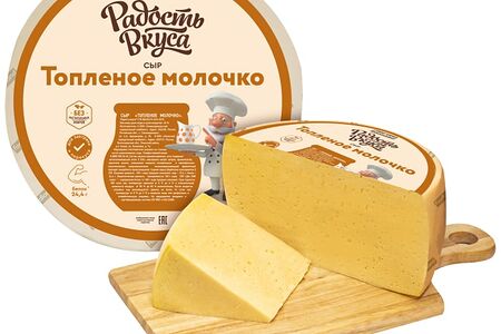 Сыр Радость вкуса Топленое молочко 45% 250г производится по оригинальному рецепту из цельного молока без добавления растительных жиров, отличается деликатным сливочным вкусом с нотками топленого молока. В разрезе имеет однородный рисунок с хаотично расположенными глазками неправильной формы. Содержит большое количество кальция, необходимого для укрепления костной системы, натрия и фосфора. Универсальный продукт в кулинарии: легко режется и натирается, не крошится, хорошо плавится. Подходит для приготовления холодных и горячих бутербродов, салатов и запекания.