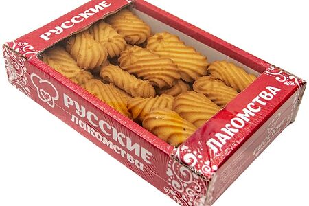 Сведения о составе: Мука пшеничная в/с, маргарин (рафинированные и дезодорированные масла в натуральном и модифицированном виде (пальмовое масло и его фракции, подсолнечное масло), регулятор кислотности - лимонная кислота), сахар, сухие яичные продукты, соль, разрыхлитель - сода пищевая, ароматизатор "Ваниль". Содержит глютен, яичные продукты. Может содержать следы арахиса, кунжута, орехов, соиПищевая ценность: 421,7,16.9,64.2Условия хранения: 23,13Срок годности в днях: 90Страна изготовления: РоссияСведения об упаковке: Картонная коробкаПроизводитель: ООО ТД Русские Лакомства