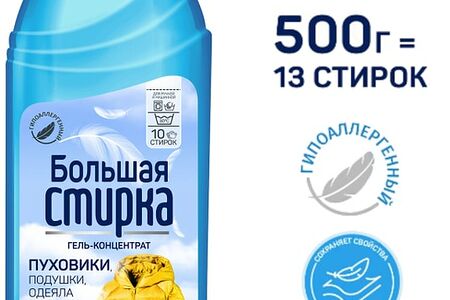 Гель для стирки пуховиков Большая стирка 500мл отлично подойдет для ручной или автоматической стирки спортивной одежды, изделий из мембранных тканей, подушек и одеял, курток и комбинезонов с пуховым и синтетическим наполнителем. Его активная формула содержит комплекс 7 энзимов, который эффективно устраняет самые сложные пятна, сохраняя первоначальный цвет и структуру тканей. Кроме того, средство борется с неприятными запахами, препятствует склеиванию пуха и пера, не дает наполнителю сбиваться в комки, быстро выполаскивается из тканевых волокон. Гипоаллергенность геля подтверждена протоколом института им. Пастера. Такой флакон рассчитан примерно на 10 стирок.