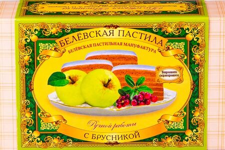 Пастила Белевская с брусникой 200г производится вручную на основе традиционного рецепта купца Амвросия Прохорова. Как и в далеком 1888 году, для ее приготовления используются только натуральные ингредиенты: яблоки сорта Антоновка, брусника, сахар и яичный белок. Душистые яблоки и спелая брусника сначала запекаются на медных противнях в дровяной печи. После остывания получившееся яблочно-ягодное пюре смешивается со взбитой меренгой. В итоге получается воздушная, ароматная и на 100% натуральная пастила без консервантов, красителей и ароматизаторов. Упакована в экологически чистый пергамент и картонную коробку.