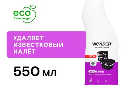Гель для чистки сантехники Wonder Lab для ванных и санузлов 750мл – инновационный, экологически чистый гель, предназначенный для очищения ванн, раковин, унитазов. Производится на основе инновационного компонента Biomicrogel из свекольного жмыха, яблочного жома и кукурузы. Благодаря густой консистенции постепенно распространяется по всей поверхности, эффективно устраняя ржавчину, известковый налет, мыльные разводы и прочие загрязнения. Деликатно воздействует на керамику, нейтрализует неприятные запахи, не оставляет следов и царапин, полностью смывается водой. Не содержит хлора. Не подходит для акриловых ванн. Wonder Lab – это принципиально новые, 100% биоразлагаемые моющие средства, которые абсолютно безопасны для людей, домашних животных и окружающей среды.