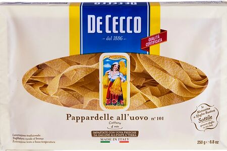 Макароны De Cecco Pappardelle all'uovo 250г - длинные макаронные изделия с яйцом родом из центральной и южной Италии. Имеют плоское сечение шириной от 11 до 15мм. Отлично сочетаются с томатными и сливочными соусами, которые благодаря слегка шероховатой поверхности пасты хорошо распределяются и пропитывают ее. Для изготовления фирменной пасты De Cecco используется оригинальная рецептура Филлипо де Чекко, крупка Semola, родниковая вода из источника в национальном парке Майелла, свежие охлажденные яйца, бронзовые формочки и старинная технология сушки. Именно поэтому паста De Cecco всегда получается упругая, с хорошей текстурой, сохраняет форму при варке и получается al dente.