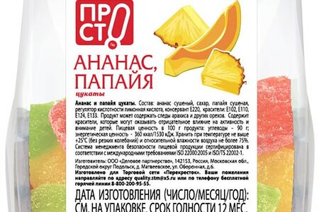 Сведения о составе: Ананас сушеный, сахар, папайя сушеная, регулятор кислотности лимонная кислота, консервант Е220, красители: Е102, Е110, Е124, Е133. Продукт может содержать следы арахиса и других ореховПищевая ценность: 360,90Условия хранения: 25Срок годности в днях: 365Страна изготовления: РоссияСведения об упаковке: ПакетПроизводитель: Деловое партнерство