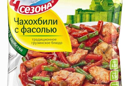 Нет времени или желания стоять у плиты? Попробуйте готовое блюдо 4 сезона Чахохбили с фасолью 600г! Все, что от вас потребуется, это прогреть содержимое пакета в сковороде или в микроволновой печи примерно 10 минут. Мясо цыпленка на кости, зеленая стручковая фасоль, сладкий перец, оригинальный пряный соус на основе томатной пасты, а также целый букет кавказских специй и приправ - что еще нужно для сытного ароматного обеда в традиционном грузинском стиле? Одной упаковки обычно хватает на двух взрослых людей.