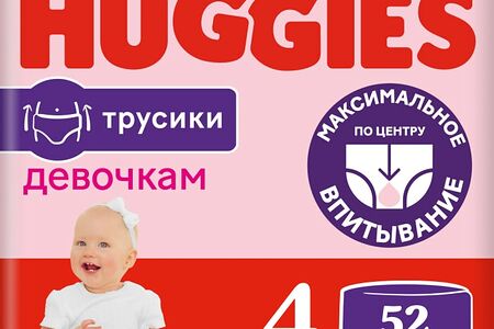 Подгузники трусики Huggies для девочек 9-14кг 4 размер 52шт с новыми героями, липучкой-утилизатором и усиленным впитывающим слоем созданы с использованием новейших азиатских материалов и технологий. В них вашей малышке будет комфортно и свободно, ничто не стеснит движения. Трусики-подгузники стали еще лучше и надежнее благодаря увеличенному впитывающему слою. Дополнительный сверхмягкий слой на пояске обеспечивает комфортную и эластичную посадку с меньшим давлением на животик, снижая риск появления красных следов на коже ребенка. В течение дня поясок адаптируется к меняющимся размерам животика, нежно обнимая его. Специальный впитывающий слой DryTouch расположен с учетом анатомических особенностей девочек (смещен к центру); он впитывает влагу за секунды, не образуя комок между ножек, и сохраняет кожу сухой днем и ночью. Мягкие эластичные резиночки вокруг ножек обеспечивают дополнительную защиту от протекания. Легко надеть — просто натяните трусики, легко снять — разорвите боковой шов. Липучка-утилизатор закроет запах на замок. Индикатор влаги подскажет, когда придет время сменить трусики. 2 замечательных новых дизайна в одной упаковке. Трусики не содержат отдушек, хлора и латекса для лучшей заботы о коже вашей активной девочки и о природе.