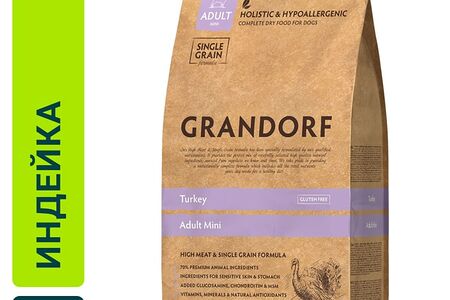 Сухой корм для собак Grandorf Adult Mini для мелких пород с индейкой и рисом 1кг - полнорационное питание класса холистик для собак от 1 года. К этому классу относятся корма, которые состоят исключительно из ингредиентов, пригодных для питания человека. В его составе содержится натуральное мясо индейки, бурый рис, масло лосося, семена льна, цикорий, зеленое яблоко, шпинат, брокколи, клюква и черника. Его формула идеально подходит для животных с чувствительным пищеварением, так как содержит только один источник белка, один источник углеводов, а также полезные жиры, аминокислоты, витамины и антиоксиданты. Благодаря комплексу хондропротекторов он обеспечит вашему питомцу крепкие кости, суставы и связки. Корм способствует укреплению иммунитета, поддержанию здоровья сердца, пищеварения и почек, улучшению качества шерсти и кожи. Отсутствие аллергенных компонентов помогает избежать аллергической реакции и пищевой непереносимости питания. Не содержит кукурузу, пшеницу, свеклу, горох, субпродукты, яйца, курицу, куриный жир, соль, сахар, красители, ароматизаторы, сою и ГМО. Суточная норма кормления: для собак весом от 1 кг до 2 кг - 30-45 гр, от 3 кг до 4 кг - 50-75 гр, от 5 кг до 6 кг - 80-105 гр, от 7 кг до 8 кг - 100-130 гр, от 9 кг до 10 кг - 120-150 гр.