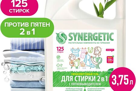 Гель для стирки Synergetic Универсальный 2в1 3.75л - концентрированный гель с эффектом пятновыводителя для белого и цветного белья из натуральных и синтетических тканей. В составе содержится уникальный комплекс из пяти видов энзимов и растительных ПАВ. Благодаря этой комбинации средство эффективно удаляет загрязнения, свежие пятна и на 100% вымывается из волокон. Предназначен для ручной и машинной стирки при температуре от 15 до 90 градусов. Безопасен для детей и людей с чувствительной кожей. Под воздействием природных факторов распадается на вещества, безвредные для окружающей среды. Не содержит ароматизаторов, красителей, фосфатов, фосфонатов, акрилатов, агрессивных ПАВ, ЭДТА и SLS. Экономичная упаковка.